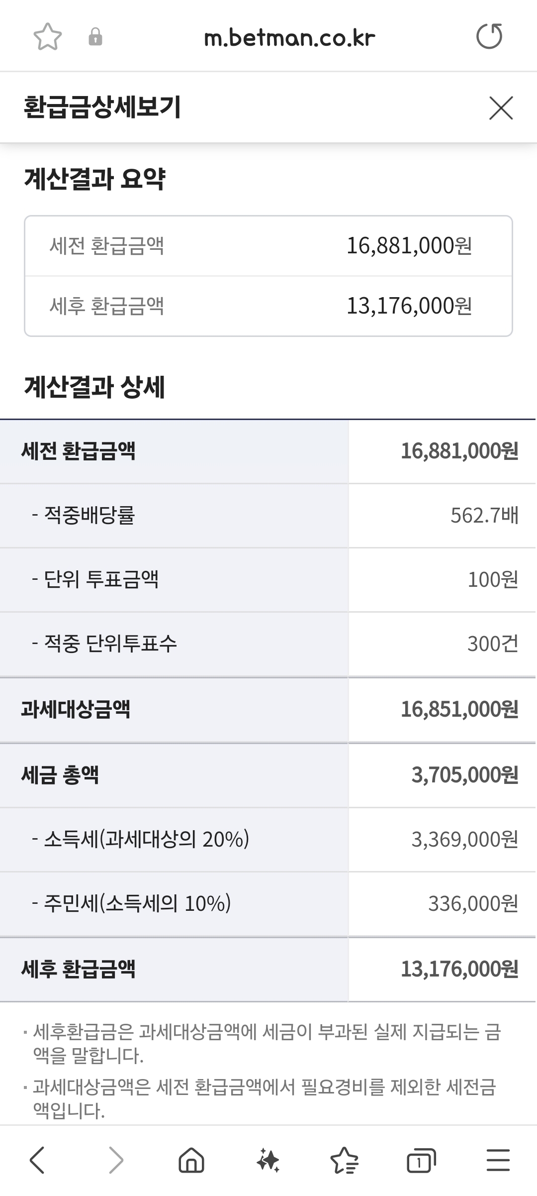 로또나 연금은 잘안사고 프로토 승부식만 간간히 5만원이하 소액으로 하는편인데 배트맨접속해서 일요일 밤경기에 축구 승부식 배팅걸어놓고 월요일 잊고있다가 과세환금신청하라는 문자를 받고  머리가 갑자기 띵해지면서 배트맨사이트에 황급히 접속해보니 적중!! 이렇게 놀란건 몇만원 몇십만원이 아니고 무려 1600만원짜리 적중금이 걸린배팅이었다는거.. 세금떼고 1300만원..